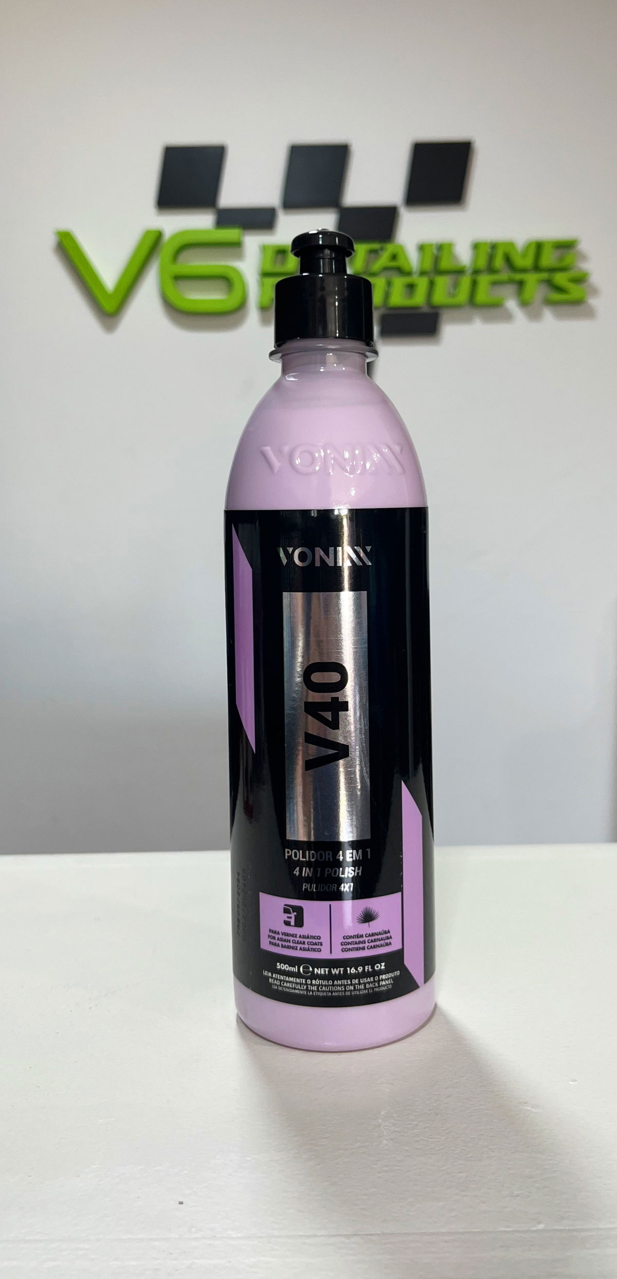 V40 es una pulidora 4 × 1, desarrollada para su uso en lacas asiáticas o extra suaves. Su fórmula exclusiva permite su uso en los tres pasos de pulido solo con el intercambio de pads, promoviendo la protección contra la luz de la cera de carnauba.