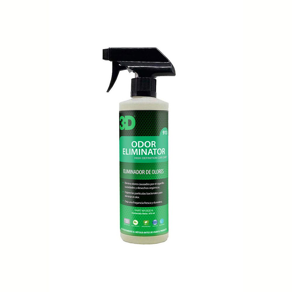 3D ODOR ELIMINATOR es una enzima bacterial concentrada, formulada para eliminar y neutralizar los olores causados por vómito, comida, mascotas, humo de cigarrillo, basura, humedad, etc. Único producto en su tipo certificado “libre de salmonela”, es ideal para utilizar en hospitales, escuelas, departamentos, cocinas, baños, garaje y vehículos y embarcaciones de todo tipo. Sus encimas eliminan las bacterias causantes del mal olor, mientras que perfuma el ambiente con su suave fragancia. Es ideal para el uso en vehículos.