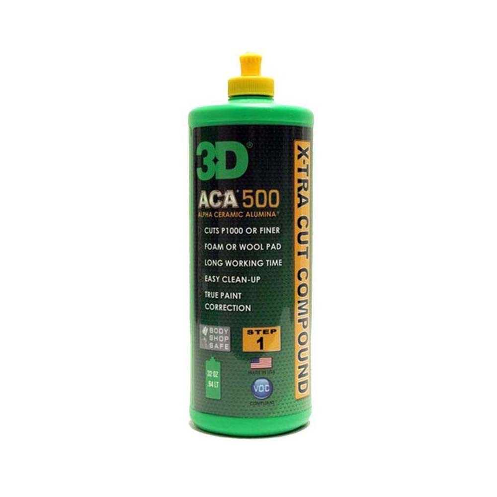 3D ACA 500 X-TRA CUT COMPOUND es fabricado con ALFA-ALUMINA CERAMICA. Alfa-Alúmina Cerámica es un nuevo y revolucionario abrasivo el cual ha sido desarrollado para generar menor calor, mayor velocidad y para corregir las capas transparentes más difíciles e inclusive pinturas de una sola capa.