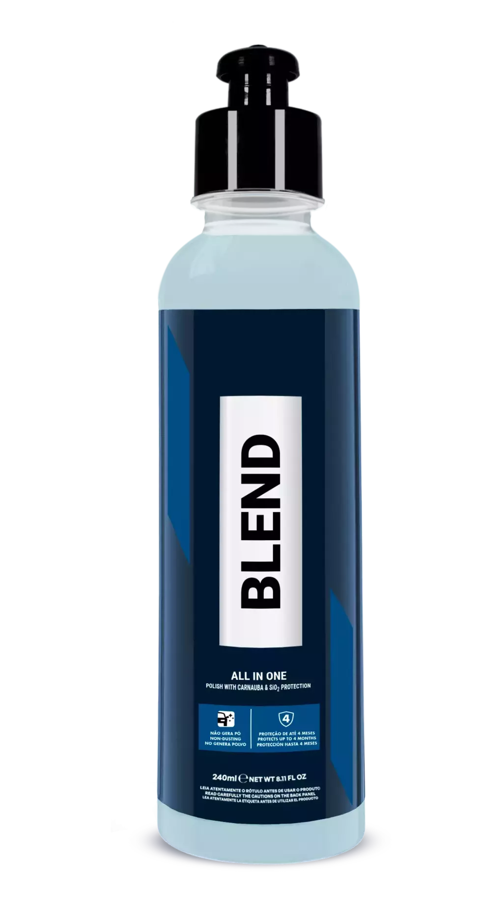 Blend All In One es un pulidor de una sola etapa con protección, que combina el brillo de la carnauba y la resistencia cerámica del SiO2, promoviendo también la repelencia al agua en la pintura. Su alto poder de corte elimina rayones y remolinos de medios a severos (comparables a P2000 o marcas de lijado más finas), dejando un gran acabado al mismo tiempo.