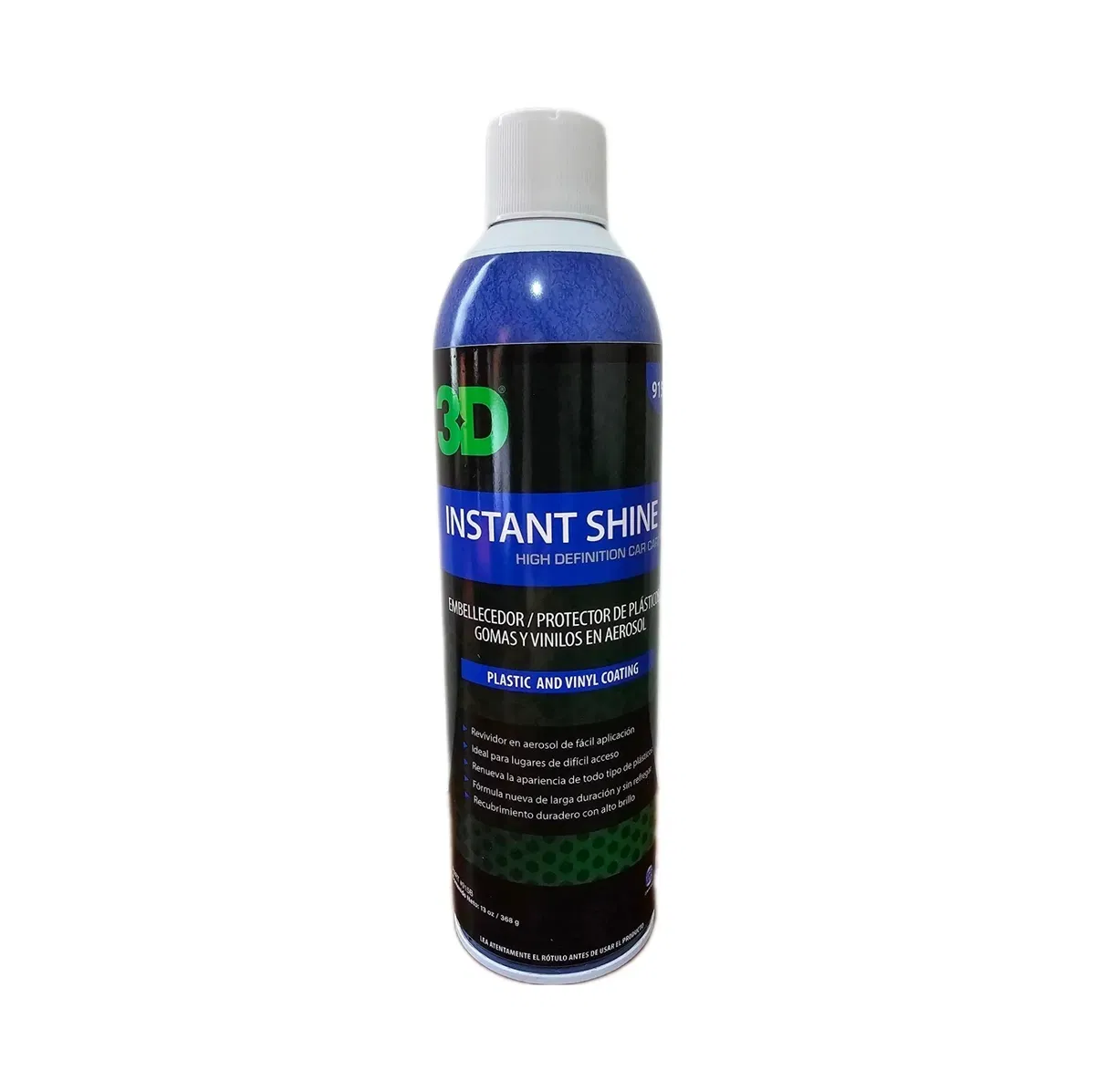 Instant Shine es un embellecedor rápido y de alto brillo para todos los plásticos, vinilos y gomas en el exterior e interior de sus vehículos. Brillará instantáneamente y protegerá la superficie de su vehículo. 3D Instant Shine también funciona muy bien en la capota de los vehículos. Ideal para embellecer áreas de difícil acceso, como rejillas de ventilación, paneles de puerta etc.