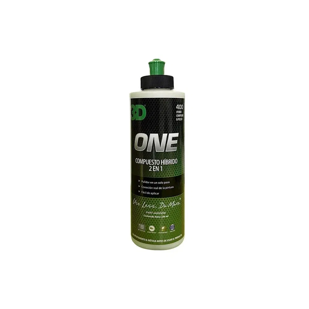 3D ONE es un compuesto hibrido, ya que permite realizar un primer paso de corte y también un último paso de Pulido/finalizado. Este producto contiene abrasivos de alúmina nano cerámicos que corrigen fácilmente los swirls y marcas de la pintura. Se puede utilizar tanto una pulidora Dual Action (Roto orbital) como una pulidora rotativa de alta velocidad. Para eliminar rayas o marcas profundas y utilizarlo como producto de corte, aplíquelo sobre un paño de lana/cordero o espuma de corte. Para corregir marcas livianas, aumentar el brillo en la superficie y utilizarlo como producto de Pulido/finalizado, aplíquelo sobre un paño de espuma suave de finalizado. 3D ONE es un producto fácil de usar, fácil de limpiar y deja un acabado perfecto en todo momento. Se recomienda para un mejor funcionamiento aplicar en lugares cerrados y frescos.