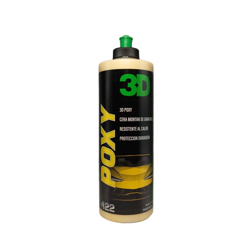 3D POXY es una cera selladora de larga duración. Otorga brillo y protege durante un período prolongado. Es un sellador / cera de pintura híbrida que se ha diseñado para adherirse a la superficie pintada para brindar protección y un brillo duradero. Funciona excepcionalmente bien en todos los colores, incluidas las pinturas de color oscuro. A diferencia de cualquier cera disponible, 3D POXY le dará un acabado profundo y brillante al mismo tiempo que protege contra los excrementos de pájaros, lluvia acida, manchas de agua dura, contaminación, etc. 3D POXY es la cera más resistente al calor del mercado. Carnauba Wax se derrite a 86 ° C, mientras que el punto de fusión de Montan Wax es 95 ° C. Se puede aplicar tanto a mano con un aplicador de puliespuma o con maquina roto-orbital con pad de finalizado.