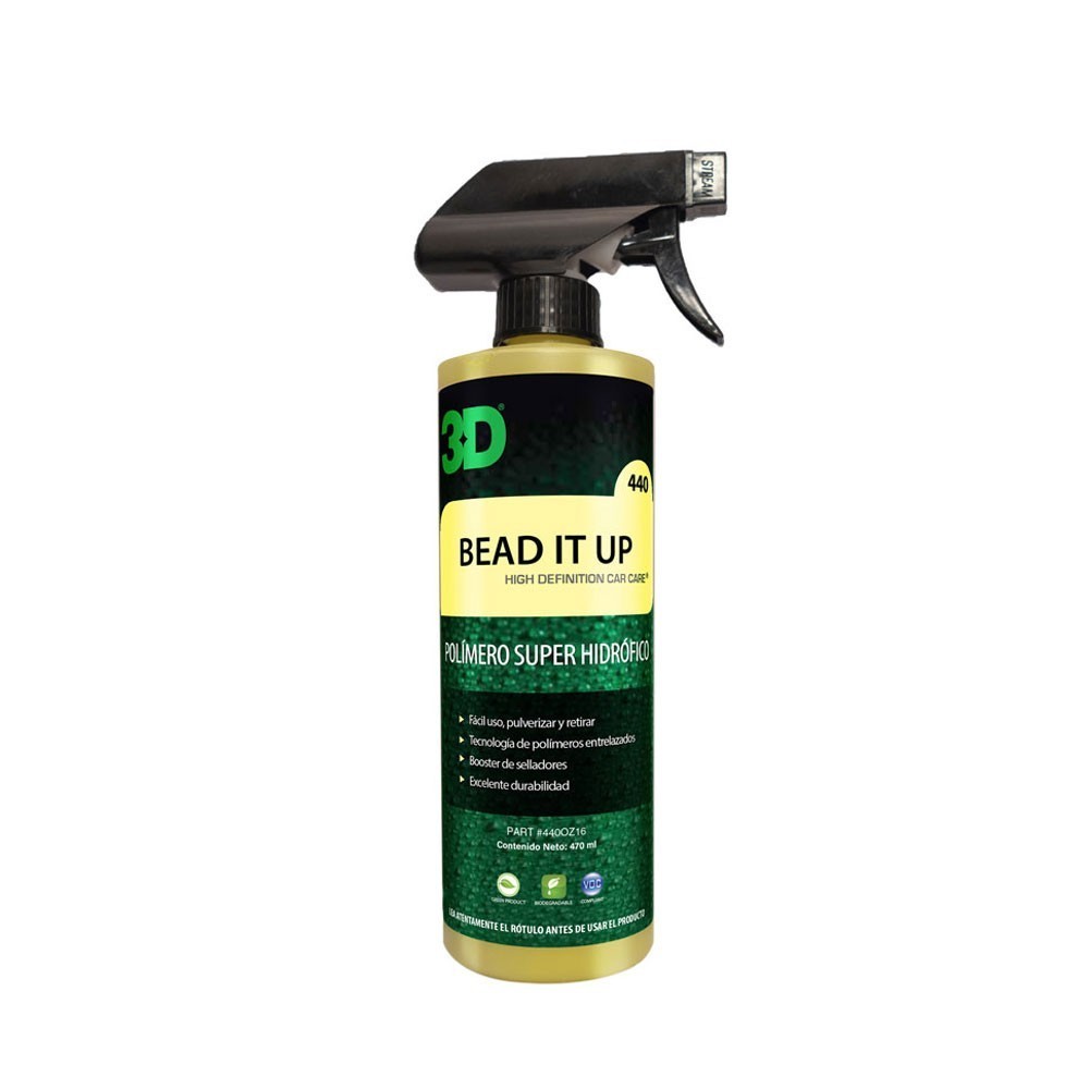 3D Bead It Up es un producto que da protección y repelencia al agua, otorgando un gran brillo y terminación de salón. Se puede aplicar sobre cualquier superficie: pintada, cromo, plásticos, molduras, vidrios, etc. Se aplica fácilmente luego del lavado del vehículo. Este nuevo producto puede ser utilizado como booster para reforzar y mantener los tratamientos cerámicos pre existentes y ademas se puede utilizar para dar repelencia al agua y dar brillo sobre cualquier superficie sin sellador.